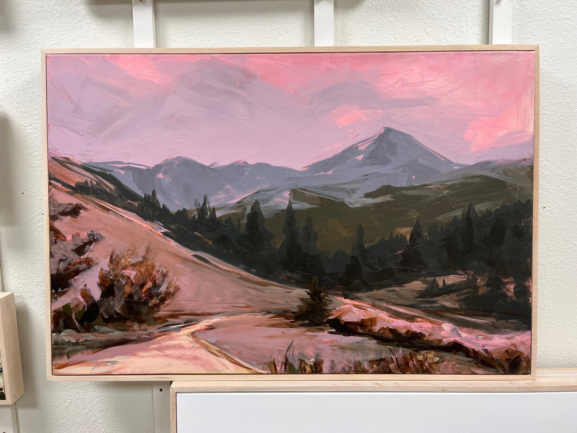 This painting comes framed and ready to hang in a maple wood frame.